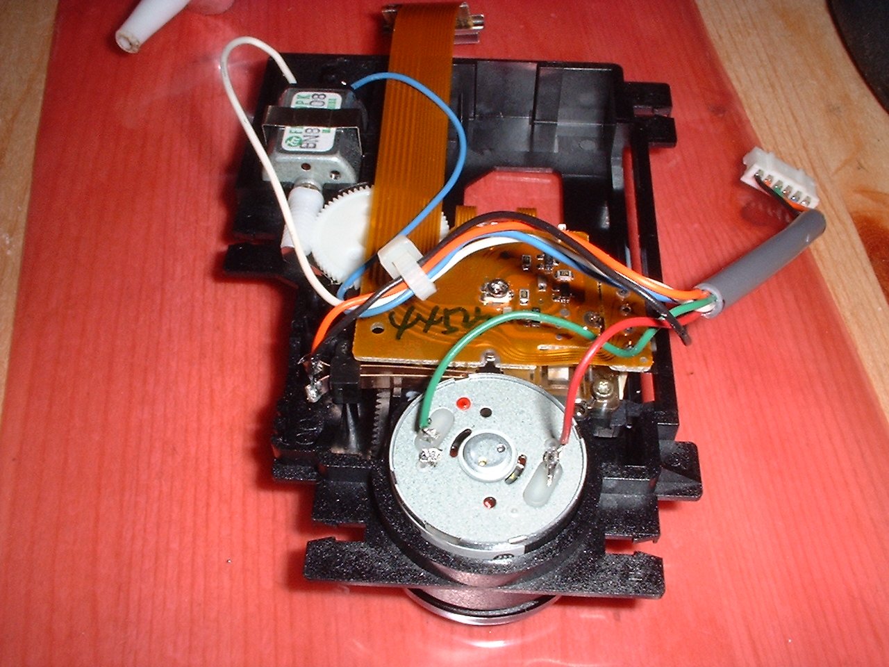 The above picture shows the wiring of what I have called the "Zero switch" (reports when the laser is at zero position, I know floppy drives have one, so why not! :) ), as you can see the orange wire has been broken off the solder join by some heavy handed lug (OOPS! see I told you they were delicate wires! :) ). I don't think the order of these wires is too critical, but better safe than sorry. On my unit they were as follows: